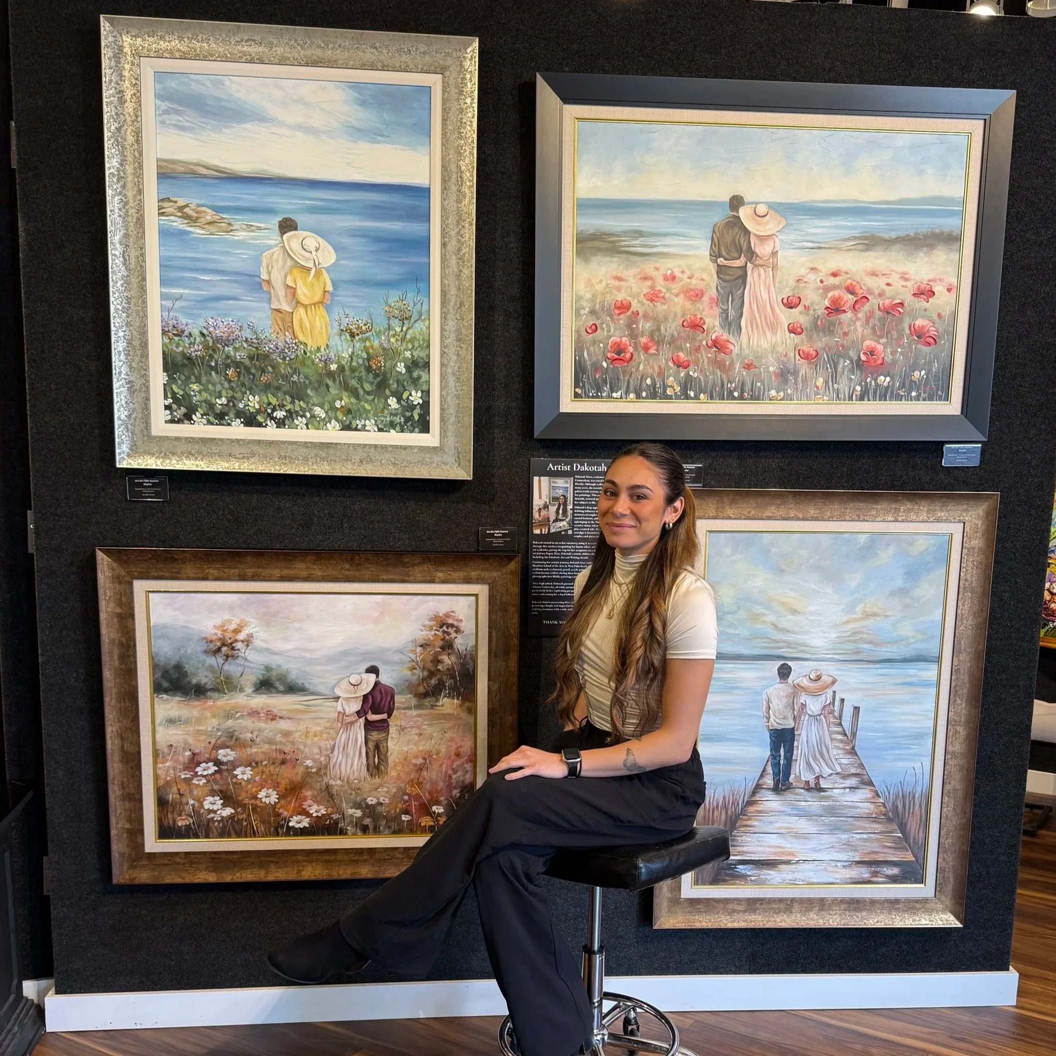 Dakotah’s deep appreciation for the outdoors has become a defining influence in her recent work, capturing intimate moments of couples surrounded by wildflower fields, coastal horizons, and serene mountain landscapes. Her upbringing in the Northeast continues to inspire her creative vision, where the values of family and connection play a central role. This profound sense of togetherness and nostalgia is beautifully reflected in her latest paintings of couples shown in Procaccini Galleries, each piece radiating emotion and authenticity.